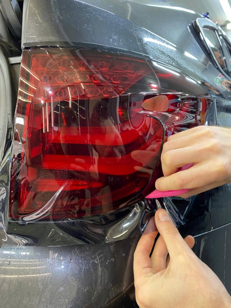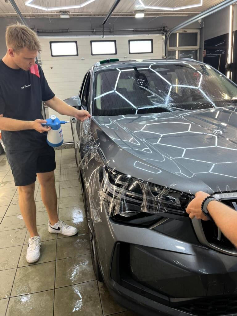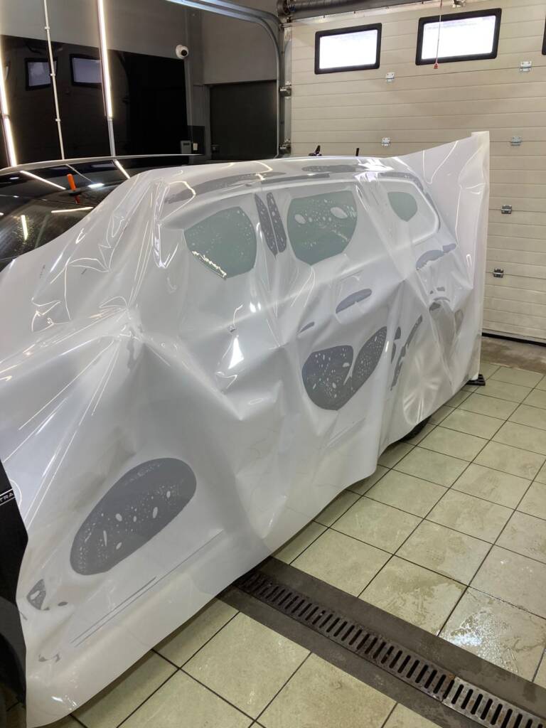 - Przygotowanie: Auto przechodzi pełną dekontaminację i korektę lakieru (jeśli jest wymagana), aby nie zamknąć pod folią żadnych rys.