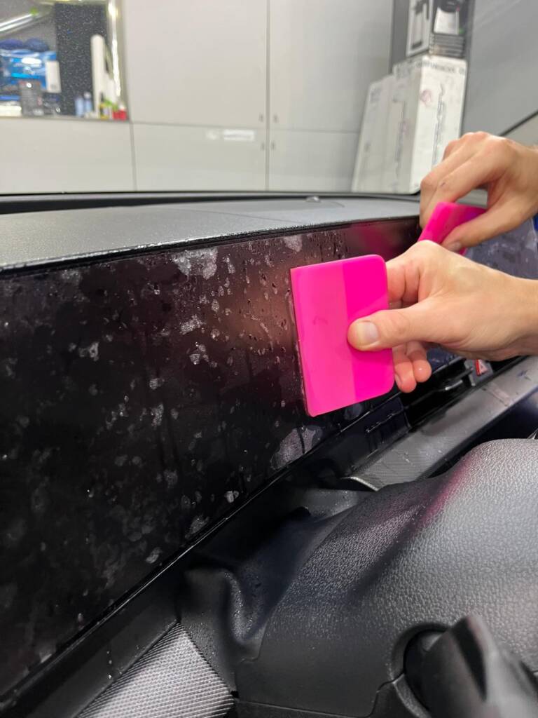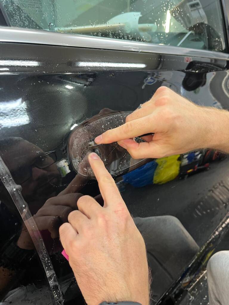 - Precyzyjny wykrój: Korzystamy z dedykowanych ploterów i bazy szablonów do konkretnych modeli aut LUB aplikujemy folię z „brytu” (custom), docinając ją ręcznie na aucie (bez nacinania lakieru!).